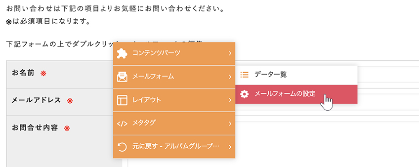 フォームの上で右クリックして、表示されたショートカットメニューから[メールフォーム][メールフォームの設定]を選択します。